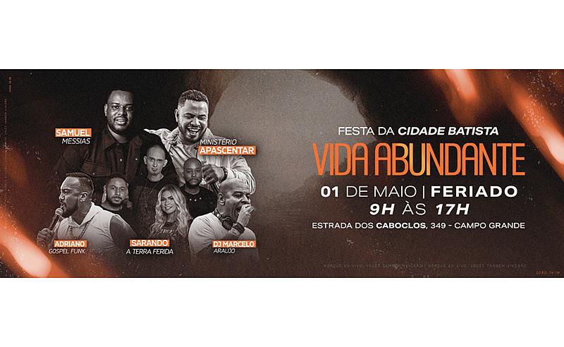 A tradicional festa da Cidade Batista, que acontece todos os anos no feriado de 1º de maio, está confirmada. Marcada para iniciar às 9h, a edição deste ano terá shows de Samuel Messias, Ministério Apascentar, Sarando a Terra Ferida, Adriano Gospel Funk e DJ Marcelo Araújo.
