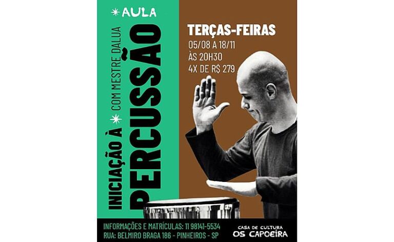 A Casa de Cultura Os Capoeira, espaço que é dedicado à valorização da capoeira, percussão e música, está com inscrições abertas para iniciação à percussão com o renomado mestre Dalua — músico premiado, capoeirista e parceiro de grandes nomes da música como Elza Soares, Ney Matogrosso e Maria Rita.